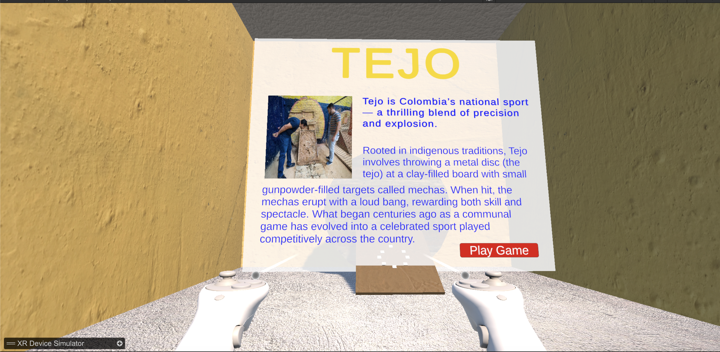 Tejo VR is a culturally immersive virtual reality experience that brings Colombia’s national sport to life. In this fast-paced simulation, users enter a lively arena inspired by real Tejo fields and compete by throwing metal discs (tejos) at a clay board lined with mechas—small explosive targets. Designed to blend physical motion, playful competition, and cultural education, this experience introduces players to the heritage of a game still played across rural and urban Colombia,