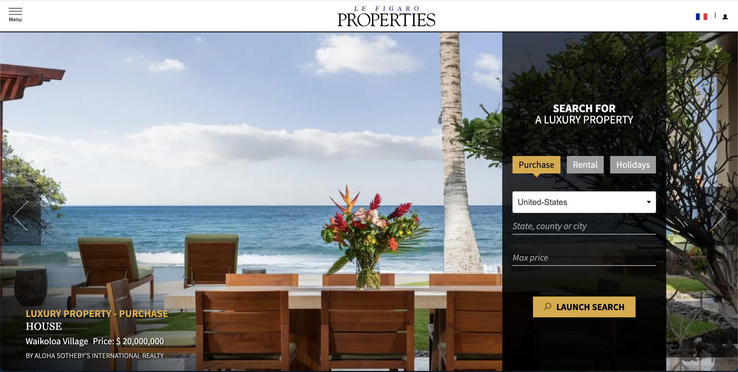 Le Figaro Properties is another website that sells/rents properties globally. Their home page has a more interesting look than the previous two as it mixes the filtering with the hamburger menu in order to not create an overwhelming look for the users. By applying the filtering option at the home page they quickly and efficiently redirect the user to where the user wants to go. Therefore, the minimize the possibility of the user getting frustrated and leaving the webpage before their task is completed.